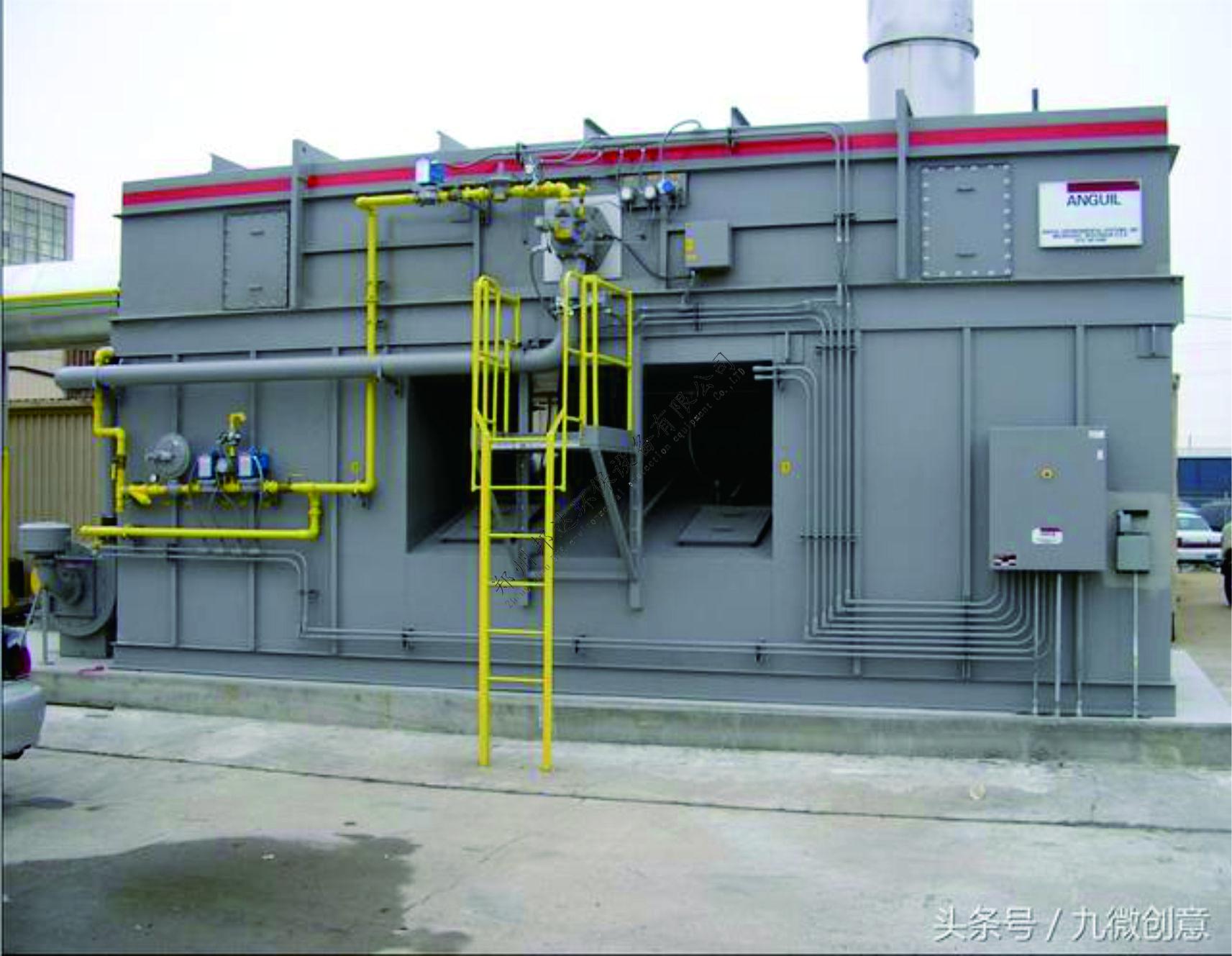 脱附出高浓度VOCs(volatile organic compounds)气流,以氧化风机抽送至蓄热式焚化炉(RTO)内燃烧焚化处理,排放出干净CO2(g)及H2O(g)至大气。燃烧室高温气流被引出至气对气热交换器,与常温空气进行热交换、升温至脱附温度的热流,供脱附使用达到省能目的。