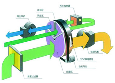 转轮内VOCs(volatile organic compounds)被浓缩成饱和沸石区、再利用热交换器提供的热流(约200℃)来进行脱附,脱附完成后旋转至冷却区,以常温空气吹嘘冷却至常温、再旋转至吸附浓缩区。